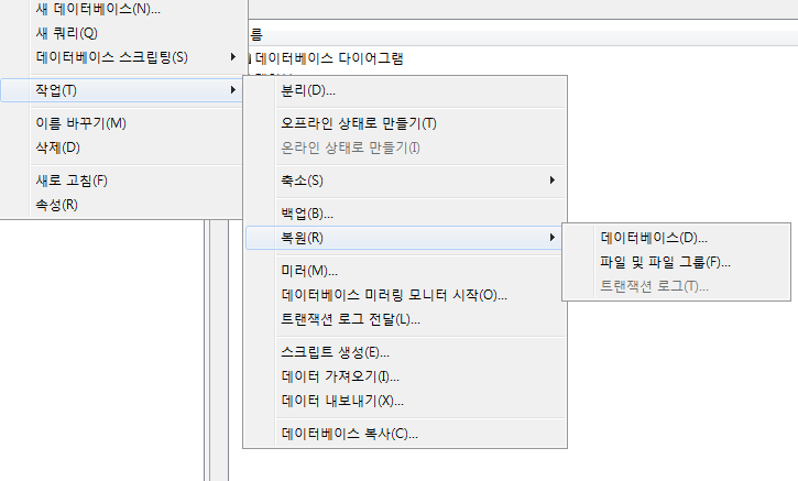 새로 생성한 데이터 베이스 오른쪽 마우스 클릭 → 작업 → 복원 → 데이터베이스 클릭.