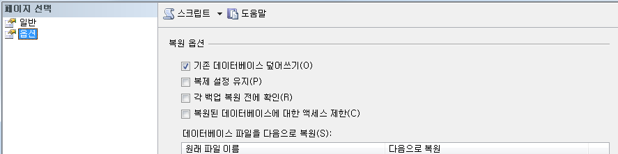 복원 체크박스 선택. → 옵션 클릭. → 복원 옵션에서 기본 데이터베이스 덮어쓰기 선택.