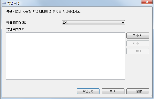 추가 버튼 클릭. → 백업 파일 선택. → 확인 버튼 클릭.
