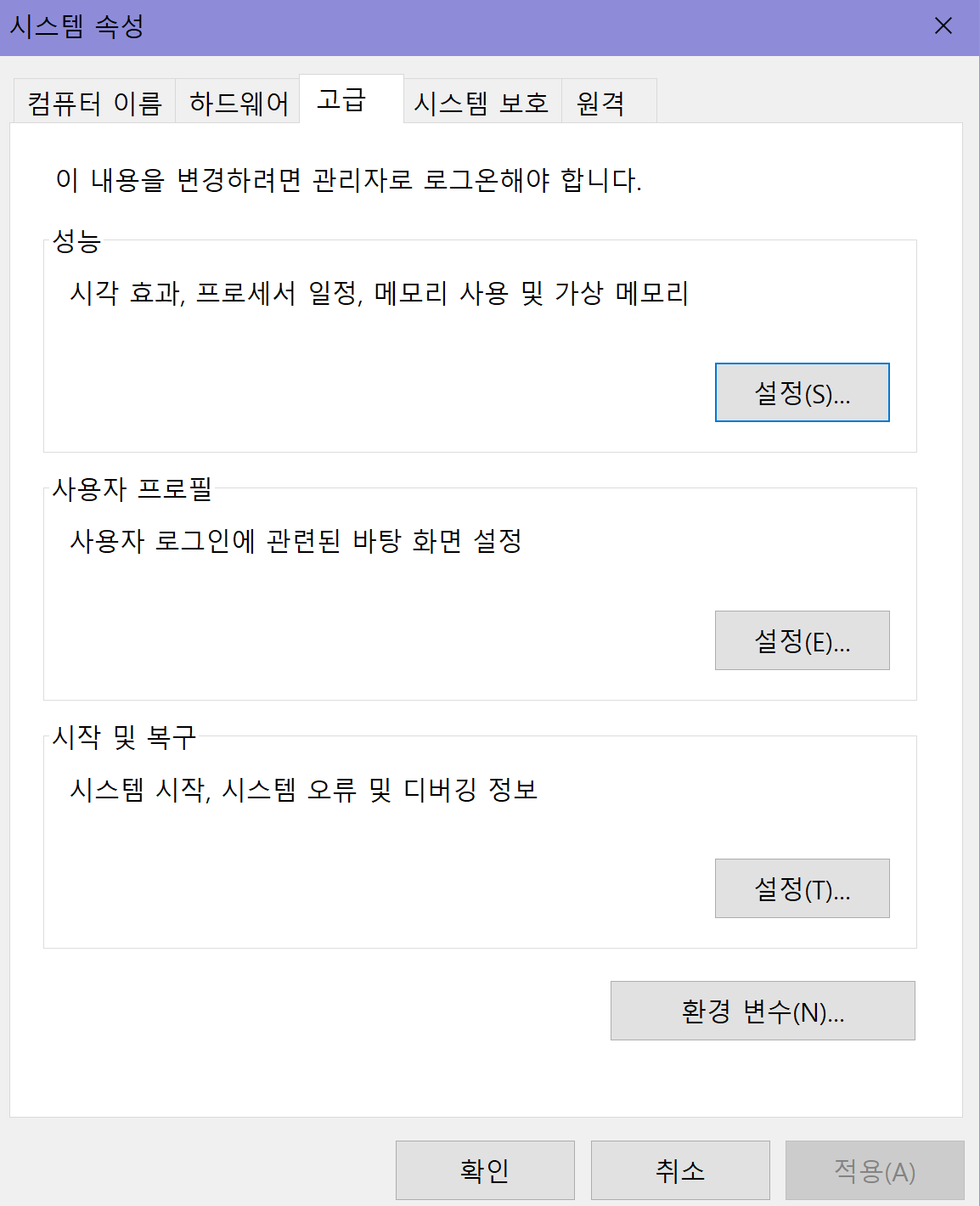 시스템 속성에서 환경 변수를 누른다.
