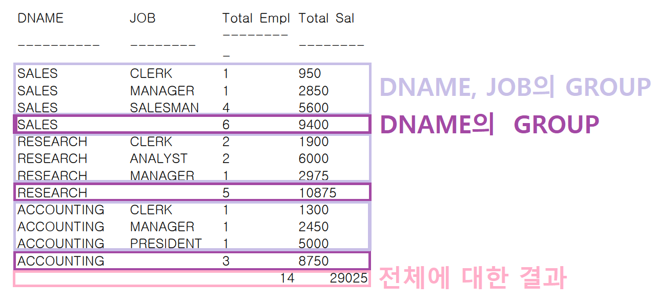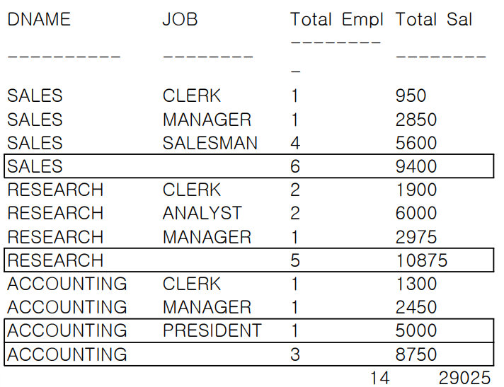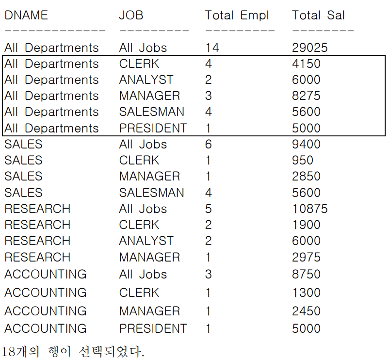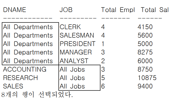 - 괄호로 묶은 집합(DNAME, JOB) 별로 집계를 구할 수 있다.