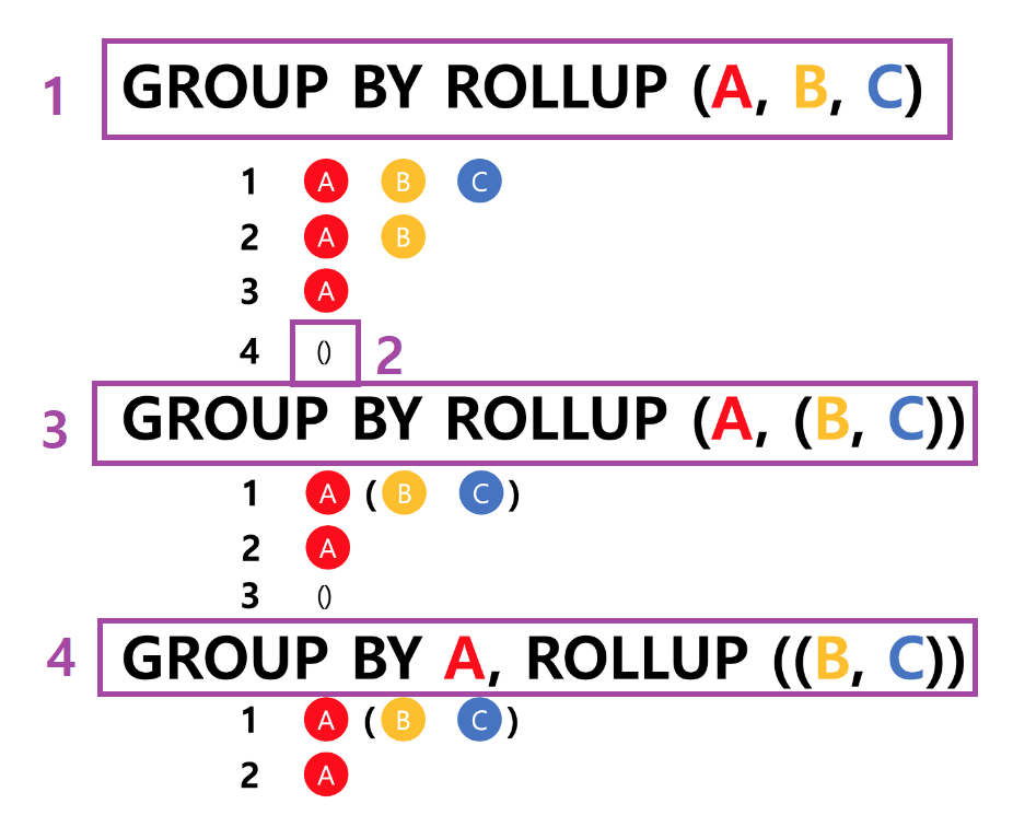 - ROLLUP의 인수는 계층 구조이므로 인수 순서가 바뀌면 수행 결과도 바뀜.